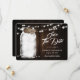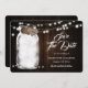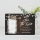 Casamento russo salve o cartão de datilografia com um jarro de pedras e corações de burlap contra um fundo de madeira de celeiro adornado com luzes de cordas. Personalizar facilmente este romântico casamento rústico salve a data online. Itens correspondentes disponíveis para complementar este casamento no país rústico salvem a data.