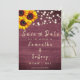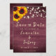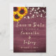 Convide amigos e família para o seu casamento rústico! Esta bela salva o cartão de data retrata um girassol, madeira de burlu e luzes de cordas. Personalize com seus nomes, data do casamento e texto preferido. Veja outros itens nesta coleção com este design de girassol de madeiras rústicas.