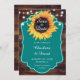 Casamento rústico e personalizado salve o cartão de data com girassóis e lanternas de cordas em um fundo de madeira de celeiro.