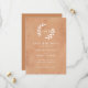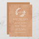 Este casamento simples, mas elegante, salve o cartão de data com um fundo de cor de pêssego e argila com texto branco. No topo está o espaço para as iniciais do casal de dois ramos desenhados à mão.