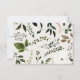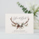 Cartão de aviso de casamento rústico com folhagem, floral e chifres de cervo. Com bela folhagem aquarela, flores brancas, fatia de madeira e escrita à mão. Este convite moderno certamente definirá o estilo da sua festa próxima.