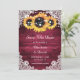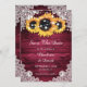 Casamento personalizado de burgundy e girassol, exceto o cartão de data com girassóis contra um fundo de madeira rústica, enfeitado com luzes de cordas e um lugar floral branco. Estes casamentos florais, salvando os cartões de data são perfeitos para um país rústico e burguês, ou festa de casamento de celeiro inspirada pelas flores de girassol.