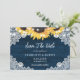 Casamento de marinho rústico e girassol, personalizado, salva os cartões de data com girassóis em um fundo de madeira enfeitiçado com rendas florais brancas e luzes de cordas. Itens correspondentes disponíveis.