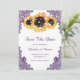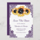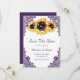 Casamento russo de púrpura e girassol, salvo cartões de data com girassóis, lanternas e rendas florais roxas. Itens correspondentes disponíveis para complementar este casamento rústico com as mulheres roxas salve os cartões de data.