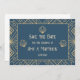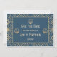Casamento estilo Art Deco salvar cartão de data com fundo azul marinho e motivos geométricos dourados