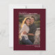 Este cartão Save the Date é simples, moderno, minimalista e clássico. Ele apresenta sua foto vertical ou orientada a retratos em um fundo cor de burgundy, maron ou vinho tinto com seus nomes, a data e o local do casamento e o título "Salvar a data" dispostos simetricamente acima e abaixo da foto. Artsy e sofisticado, este cartão é uma maneira maravilhosa de deixar sua família e amigos saberem sobre seu próximo casamento.