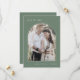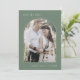 Este casamento simples da montanha moderna, com a fotografia de uma arca, salvo o cartão de data é perfeito para um casamento de destino de madeira. O design verde-sábio escuro apresenta uma tipografia simples e rústica com uma sensação de montanha de floresta. Personalize suas datas com uma foto de noivado, seus nomes e sua data de casamento. Adicione seu site de casamento à parte de trás do cartão.