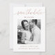 Este casamento moderno Salve a data apresenta uma bela caligrafia de cobre e uma fotografia com uma sólida tratuta marrom.