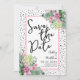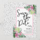 Um design tropical que abraça a beleza tranquila da natureza misturada com uma pitada de diversão que certamente ajudará a se divertir. Uma mistura de folhas tropicais verdes calmantes, incluindo folhas de bananeira, palmeiras, folhas de monstera e plantas princesa rosa, ao lado de flores de orquídea roxa-rosa e flores de protea, entrelaçadas com várias outras folhagens. Adicionando um elemento de diversão, um fundo preto de "ponto bagunçado" ou "ponto dálmata" infunde o design com um toque lúdico. Aumentado por uma fonte manuscrita moderna, essa impressão encantadora irradia charme e sofisticação. Esse design versátil traz um senso de paraíso tropical para qualquer ambiente ou ocasião especial, tornando-o perfeito para um casamento de destino ou apenas quando você deseja adicionar um toque tropical. Floral Colorido Palmeira Aquarela Tropical Casamento Salve a Data