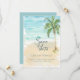 Casamento temático da praia Salve o cartão de data com um oceano de cor d'água, areia e paisagem da palmeira. Perfeito para temas de casamento de praia, tropical, ilha e destino. Estoque da KL original