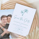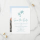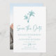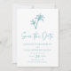 Este simples casamento de praia tropical salvo o cartão de ponto apresenta duas palmeiras no topo, com texto elegante clássico, em um esquema de cor azul-branco/turquesa, com um modelo de foto no verso.