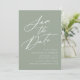 Elegante salve a data com "Salvar a Data" exibida em um script de caligrafia branco com um plano de fundo verde sábio. Personalize a caligrafia, salve a data com seus nomes, data e local do casamento e site do casamento. A design não-fotográfica coordena-se com a nossa coleção de casamento Elegante Calliografia.