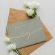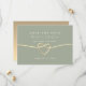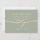 Casamento moderno, elegante, verde sage minimalista, convite de save the date com letra à mão simples e coração de corda dourada.