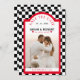 Casamento de jantar retrô salve a data. Fundo da prancheta de verificação com esquema de cores vermelho, preto e branco. Excelente para um visual e uma sensação antigos dos anos 50. Personalize-o adicionando seus detalhes de casamento e uma foto de casal.