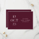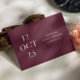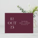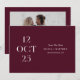 Compartilhe a data do seu casamento com uma elegância romântica e ousada usando este cartão minimalista de Save the Date em vinho escuro (também conhecido como ameixa borgonha). O impressionante layout editorial da data na frente faz uma declaração visual refinada, enquanto o verso apresenta espaço para uma foto completa do casal para adicionar calor e personalidade. O rico tom de vinho traz profundidade e sofisticação, tornando este design uma escolha linda para casamentos de outono e inverno, celebrações noturnas, locais de vinhedos e estética romântica moderna. Personalize os nomes, data, local e foto para torná-lo seu. Disponível como cartão impresso e download digital.