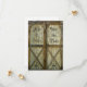 Duas portas de celeiro são apresentadas neste design ocidental rústico. Os painéis da porta têm os nomes do casal e a frase, Salve a Data. Corresponde ao convite de casamento Porta de Celeiro.