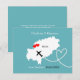 Um divertido save the date para casais que se casam em Ibiza com um mapa de silhueta branca de Ibiza em azul turquesa com corações de amor vermelhos e muito fácil de personalizar com seus nomes e mensagem pessoal