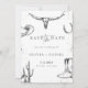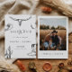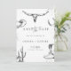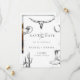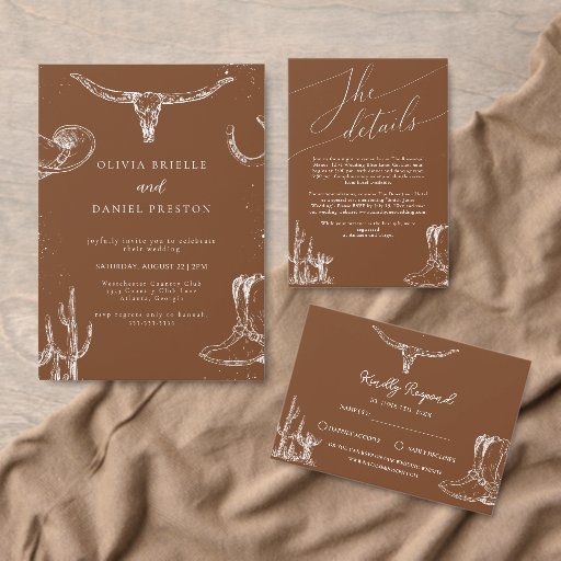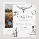 Celebre o seu amor com este cartão de "save the date" de casamento rústico western cowboy. Este design apresenta ilustrações western desenhadas à mão, incluindo um crânio de longhorn, cacto, botas de cowboy, ferradura e chapéu em um fundo terracota quente. Perfeito para casais que planejam um casamento country, de rancho ou com tema western.