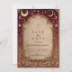 A luxurious celestial wedding design framed in deep burgundy and antique gold. This ornate baroque invitation features glowing moons, stars, and cosmic filigree — blending old-world romance with a touch of divine mystery. Perfect for celestial, gothic, or royal-themed weddings seeking a timeless yet magical aesthetic.