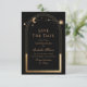 Célestial Black Save The Date Birthday Quinceanera Invitation apresenta um sol dourado, lua e estrelas num fundo preto. Dentro é a sua Quinceanera personalizada para guardar as informações da data e, no verso, adicionar a sua foto favorita. Personalize editando o texto nas caixas de texto. Projetado por ©2024 Evco Studio www.zazzle.com/store/evcostudio
