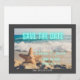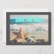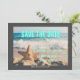 Anúncio de Save the Date moderno e não tradicional com cena de praia (que inclui ondas e estrelas-do-mar na areia) com fundo de fotografia e Save the Date em neon azul aqua. Borda cinza escuro, personalize com detalhes do casal.