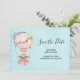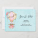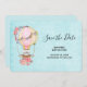 Chá de fraldas salve a placa de data com um design adorável com uma ilustração de aquarela. Um balão de ar quente decorado com flores bonito, vermelhas e rosa. Um pequeno ursinho branco giro sentado na cesta. Estilo de vindima fundo azul claro.