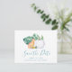 Anuncie seu chá de fraldas com meu tropical, salve os convites de data com as palavras Salvar nossa data em um estilo de tipografia de script de tendência que evoca o aspecto da letra de mão. Esta simples placa apresenta uma réplica da minha raposa vermelha de cor d'água original com folhas de monstera e abóbora branca com seus nomes, data e local do chá. Cartões invertem a cor azul turquesa contínua complementar. Perfeito para os chás de fraldas tropicais de setembro, outubro e novembro. Para ver mais designs de Victoria Grigaliunas, visite www.zazzle.com/dotellabelle.