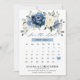 O calendário de casamentos florais azuis empobrecidos salva o cartão com buquê elegante de azul marinho, azul real, branco, marfim de champanhe, rosa de cor esbranquiçada, botões de flores ranunculus e folhas de eucalipto verdes e boquete elegante de aquarela. Entre em contato comigo para obter ajuda sobre a personalização ou se você precisar de outro produto com este design.