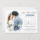 O calendário de casamentos florais azuis empobrecidos salva o cartão com buquê elegante de azul marinho, azul real, branco, marfim de champanhe, rosa de cor esbranquiçada, botões de flores ranunculus e folhas de eucalipto verdes e boquete elegante de aquarela. Entre em contato comigo para obter ajuda sobre a personalização ou se você precisar de outro produto com este design.