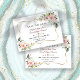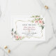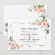 Elegante design de cartão com flores cor de rosa e folhas verdes em aquarela, uma moldura dourada falsa, divisor floral, em um fundo branco. No verso, buquê de flores cor de rosa. Use a ferramenta Personalizar para adicionar suas informações, alterar as fontes e as cores das fontes. Para itens correspondentes, visite minha Coleção de Flores Creme e Rosa.