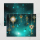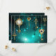 Chaves antigas douradas com engrenagens e mostradores pendem de correntes douradas em um fundo verde luminoso.