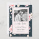 Um belo casamento floral cor-de-rosa, salvo o cartão de data apresenta um padrão botânico de delicadas flores cor-de-rosa sobre um fundo azul escuro. Bonito guarde o script de caligrafia de data e uma foto de cheio completa este anúncio moderno, salve o anúncio de data.