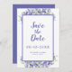 Anuncie seu próximo evento com nossa elegante tendência floral de aquarela Salve o anúncio de casamento de Data em azul-azulado! A suíte de convites apresenta um design de jardim botânico com sombras na moda de flores azuis periwinkle com verde suave em um fundo branco nítido. Personalize a design de casamento com seus primeiros nomes e data em letras e guião. A parte traseira da placa corresponde em azul de periwinkle sólido.