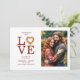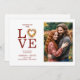 The front of the card showcases a heart-shaped floral wreath in rich autumn tones such as oranges, reds, and golds. The wreath forms the "o" in the word "love," creating a romantic and distinctive design. At the center of the wreath is a photo of the couple, adding a personalized and special touch. This design combines autumn blooms with the couple’s photo to create a visually appealing and emotional card.