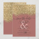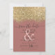 O cartão de aviso prévio de casamento elegante, glamoroso e moderno é perfeito para o casal engajado contemporâneo e sofisticado. Ele apresenta um bloco de cor salpicado com confete brilhante dourado impresso falso sobre um simples fundo rosa poeira escuro. O verso exibe o mesmo brilho, mas um painel mais grosso. Este design chic, luxuoso e único será um sucesso com todos os seus convidados!
