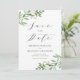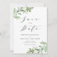 Avise aos seus hóspedes a data do seu casamento com este cartão simples de data. Apresenta uma ilustração aquosa de flores verdes e brancas com um padrão botânico correspondente. Personalize adicionando nomes, data, local e outros detalhes. Este verde que salva o anúncio da data é perfeito para primavera e casamentos no inverno.