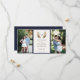Laranjas de Citros e crista de monograma verde, casamento salvo cartão com fotos de data. Creme de marfim e cores azuis de marinho e de quadro, 2 espaços verticais de modelo de foto.