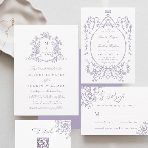 Elegant lavender vintage floral crest wedding save the date card — perfect for a modern classic or romantic vintage wedding. For more advanced customization of this design, please click the DESIGN TOOL BUTTON above!