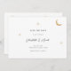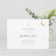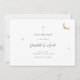 Um convite de casamento celestial moderno minimalista apresenta uma design simples e elegante. Inclui uma lua de folha de ouro e estrelas que brilham suavemente, colocadas sobre um fundo limpo. O convite usa a tipografia serif clássica, que adiciona um toque tradicional e formal com seu estilo limpo e limpo.