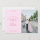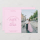 This elegant save the date card in pastel pink features "save the date" styled with a mixture of classic text and elegant calligraphy script that lends a chic, classy vibe. It also includes a placeholder for your photo that covers half of the front of the card. The back of the card includes an editable placeholder to indicate your wedding website URL that can also be deleted if the URL is not yet available.