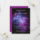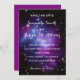 Uma bonita foto espacial de galáxia roxa e azul com um design de texto de casamento de save the date contemporâneo em branco em caligrafia. Crie seus próprios cartões de convite personalizados para um casamento no planetário ou outro local cósmico. Todas as áreas de texto neste produto de papel podem ser personalizadas. Há muito espaço para mais informações conforme necessário. O verso é uma cor roxa sólida coordenada, mas você pode alterar a cor ou copiar e colar a imagem espacial nesse lado. Tente uma orientação diferente para a imagem espacial, se desejar.