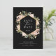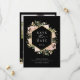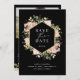Esse casamento impressionante, que salva os cartões de data, apresenta uma falso estrutura geométrica dourada cercada por flores esmagadas, neutras em aquarelas, cores de tons de terra como pêssego bege, rosa empoeirado e verde macio com sotaque e folhas douradas. Um elegante olhar floral de vassoura sobre um fundo preto escuro. A parte traseira da placa apresenta sua foto pessoal, um código QR digitalizável e espaço para texto ou detalhes adicionais.