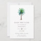 Um casamento de destino moderno, exceto a data com uma palmeira tropical aquosa. Personalize com seus detalhes e adicione seu próprio código QR ao contrário para fornecer aos seus convidados um link para o seu site de casamento.