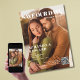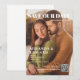 Um cartão moderno e único de salvar a data do casamento projetado para se parecer com a capa de uma revista. O cartão apresenta uma foto favorita do casal feliz com SALVE A DATA como título da revista Personalize com seus nomes, data do casamento, local e código QR para seu site.