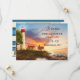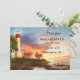 Farol costeiro Guarde o cartão Data. Esta placa Save the Date (Salvar data) apresenta uma pintura de estilo retroativo de um farol no pôr do sol. Na parte de trás está sua própria foto em um design de striped náutica. Um modelo de código QR oferece a opção de vincular facilmente seu próprio site.