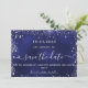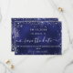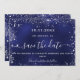 Um moderno e elegante Salve a Data para um casamento. Um fundo azul marinho decorado com faíscas prateadas falsas. A cor azul é irregular. Personalize e adicione uma data e nomes. O texto: Salvar a Data é gravado com um script de estilo com letra de tendência grande com alternâncias. Adicione a sua url de web ao seu próprio site de casamento no verso para criar um código QR.
