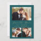 Este simples e minimalista Cartão Salvar a Data contém uma foto horizontal acima das palavras "Salvar a Data" em um elegante roteiro de escrita manual de cor dourada, seguido dos nomes do casal, da data do casamento e da cidade em sans serif em um fundo azul-real. Duas fotos quadradas menores aparecem na parte inferior do cartão. Adicione uma mensagem mais detalhada com informações adicionais na parte traseira, juntamente com um código QR para ajudar seus convidados a visitar o site do seu casamento.