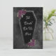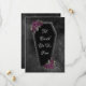 Escuro e bonito, este casamento de caixão Salve a Data é perfeito para um casamento gótico ou de Halloween. O ditado "Til Death Do You Part". A cobertura apresenta brilho de cinza prateada nas bordas e rosas roxas com folhas verdes de ouro e cinza. Linhas finas ao redor das bordas são um belo toque. O fundo é uma moody black watercolor. As costas têm espaço para as suas informações e um motivo rosa correspondente. Ver pontos coordenadores no nosso compro.