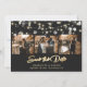 Cartões salve a data de fotos de casamento preto e ouro personalizados elegantes com uma fonte moderna. Nosso casamento salva a data mostra uma coleção de fotos de 4 imagens contra um fundo preto adornado com luzes de cordas. Personalize facilmente esse preto e ouro e salve o cartão de data com suas imagens e detalhes de casamento, incluindo um site de casamento, se desejar. Para pedidos personalizados, envie-nos uma mensagem.