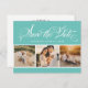 Estilo de vintagem personalizado aqua verde / azul e branco (nota, a cor de fundo pode ser modificada) casamento salvar o recurso de cartões de data "Salvar a Data" em um estilo elegante de script de caligrafia manuscrito, três (3) espaços para fotos de noivado (dica: forma de corte a quadrado antes do upload) e texto na parte traseira que pode ser personalizado com informações de casamento.